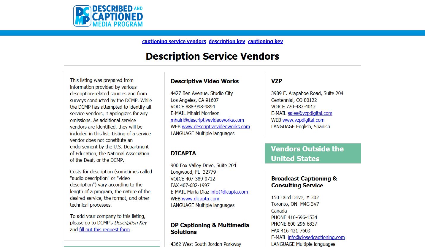 This listing was prepared from information provided by various description-related sources and from surveys conducted by the DCMP. While the DCMP has attempted to identify all service vendors, it apologizes for any omissions. As additional service vendors are identified, they will be included in this list. Listing of a service vendor does not constitute an endorsement by the U.S. Department of Education or the DCMP.